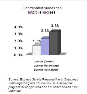 While I was searching, I also found the presentation we gave on how multi-modal coordinations using a letter and an automated call impacted success for my retail-to-mail program. The key to remember here is that we targeted people who had already received one or more letters and had not responded. The results were great.