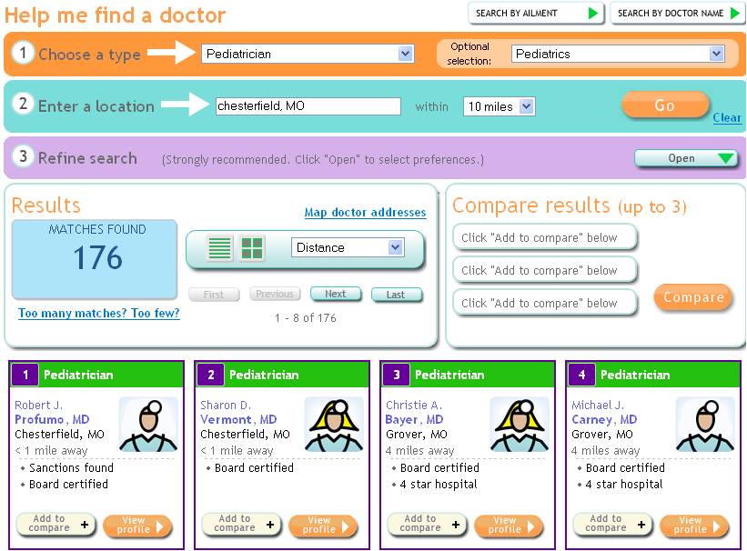 Here are a couple of screen shots. The first two show just comparing MDs. The third is the MD find and compare feature. The fourth is the rankings that they use plus an option to include free text comments.