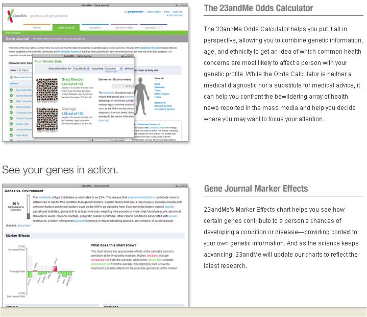 They were showing 23andMe on the Today Show a few days ago where you could pay $1,000 to get a test done that showed you your likelihood of getting certain diseases. It also showed you interesting things like where your ancestors were from and whether you tasted bitter things or sweet things. It is worth going to their site and looking at, but it brings lots of interesting questions to the table. Do you get your kids tested? Once you have the information, can you influence the future or do you take a fatalistic view of having no control?