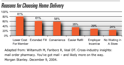 I was looking for something else in the Express Scripts Drug Trend Report 2005 when I came across this study referenced on page 209. I should have remembered since I wrote this section (yes I was a contributor see page 332). This is a Morgan Stanley study which talks about why people choose mail order pharmacy.