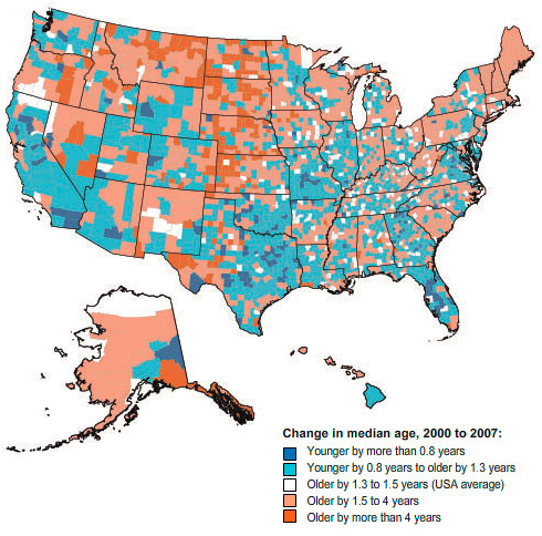 The USA Today reports this morning on the shifting demographics of the US. I found the map of the US showing the different variances from the median interesting. (Note: Median means that half the people are below that age and half are above that age.)