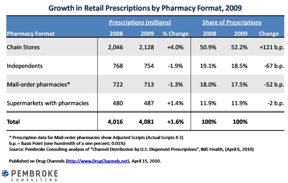 Adam Fein just published some analysis showing how marketshare is moving with pharmacies. It shows chains as the only one gaining marketshare.
