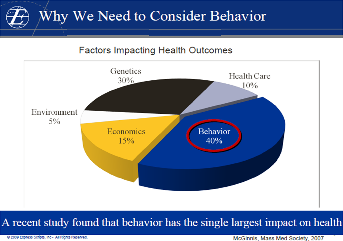 The second is a chart that everyone’s been using lately on behavior as the biggest impact on health outcomes.