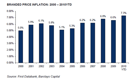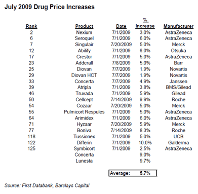 As Medco highlighted several weeks ago, brand prices are going up a lot faster than generic prices. That’s nothing new. But, Barclays Capital recently highlighted that brand prices are going up faster in 2010 than any prior year (based on First Databank data).