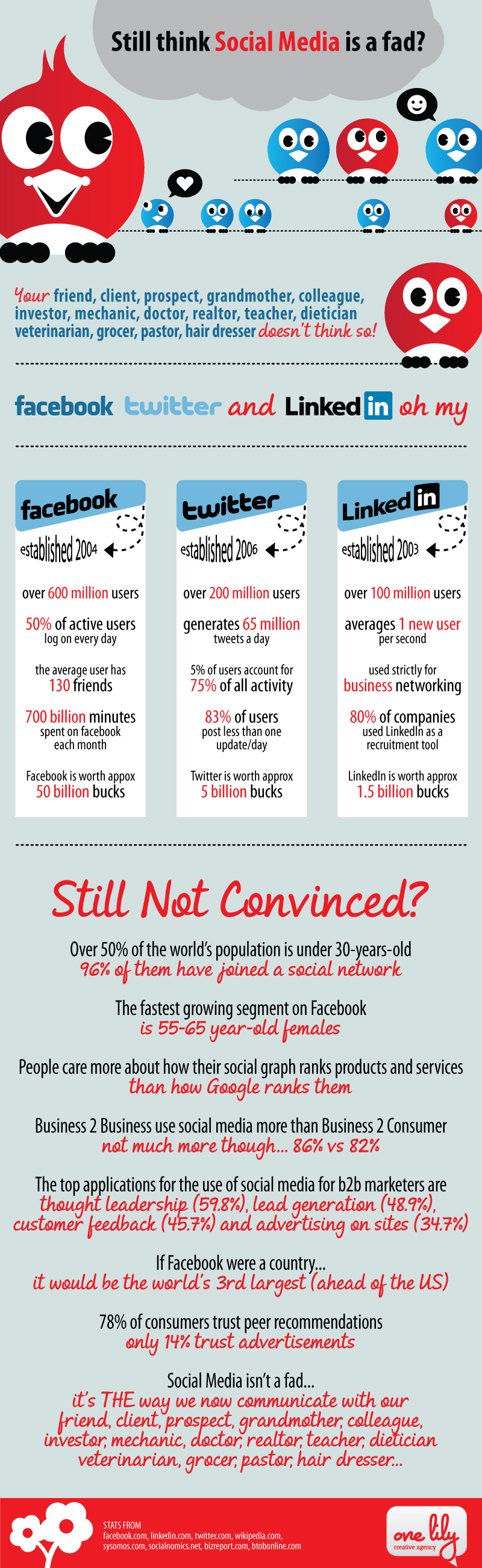 I love infographics so I’m sharing this. I personally don’t know anything that thinks social media is a fad. I think there is lots of debate about its proper use in different types of businesses especially in patient care, but I think it’s proven it’s here to stay in some form.