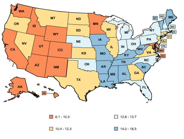 The Kaiser Family Foundation puts out lots of data. One of their sites shows state by state analysis. Here is a map of utilization by state.