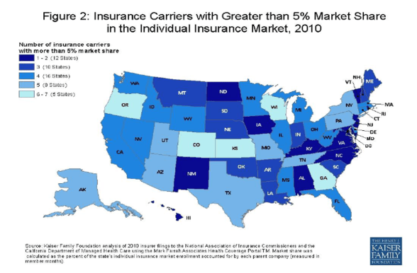 Kaiser Family Foundation just put out a new report on the concentration of health insurers within each state. It’s interesting since it has relevance on the state health exchanges.