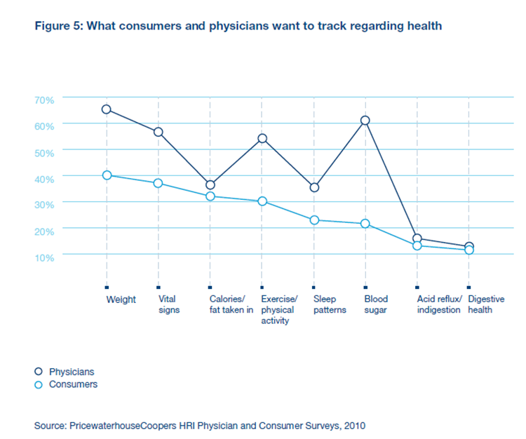 And, as you can see, they map well to the chart below which shows what data consumers and physicians want to track with weight, calories, physical activity, and sleep patterns.