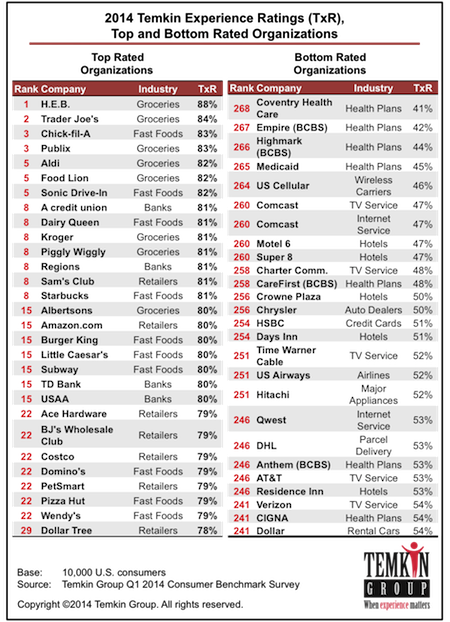 I tee this up because whenever I see the Temkin Experience Ratings I’m always amazed that the grocery chain with the worst experience rating is similar in value to the best healthplan experience.