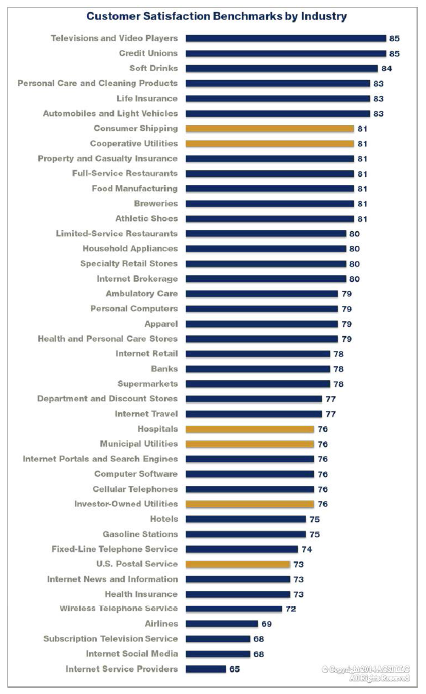 This data is from the latest American Customer Satisfaction Index (ACSI). You can see a blurb on them below along with the full ranking of different industries. Not surprising, healthcare isn’t at the top, but let me highlight a few of the categories: