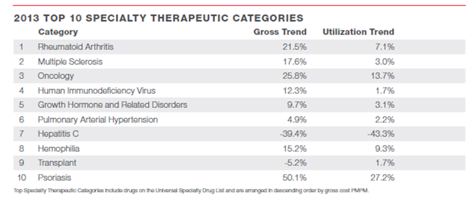So, tomorrow (10/10/13), Prime is releasing a new report – “Specialty: Today & Tomorrow” which highlights Prime’s specialty drug trend over the past year and recommends strategies that high-performing plans use to manage the steady rise in these costs. [My comments in brackets.]